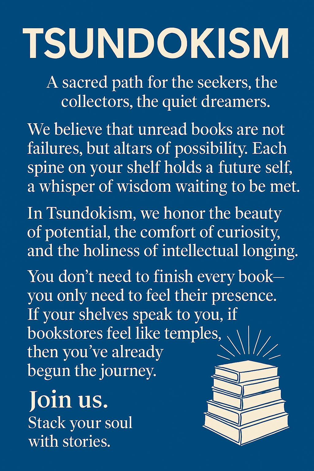 "Tsundokism transforms guilt over unread books into a celebration of curiosity and potential. Through rituals, symbolic products, and community, we offer calm, meaning, and identity in a fast-paced world."